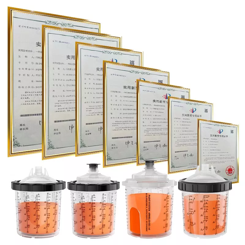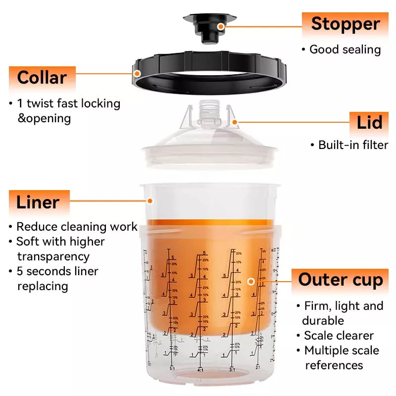 AYSPAT डिस्पोजेबल स्प्रे कप प्रणालीमा पाँच भागहरू हुन्छन्: स्केलसहितको बाहिरी कप, डिस्पोजेबल PE लाइनर, फिल्टर भएको ढक्कन, कप र ढक्कनलाई जोड्ने कलर, र आधारसहितको प्लग। यो प्रणालीले पेन्ट मिक्सिङ, फिल्टरिङ, स्प्रेइङ, भण्डारण जस्ता धेरै प्रकार्यहरू मिलाउँछ, स्प्रे पेन्टिङको लागि पूर्व तयारी प्रक्रियालाई सरल बनाउँछ, र छुट्टै पेपर फनेलहरू र पेन्ट मिक्सिङ कपहरू किन्नको लागत बचत गर्छ।