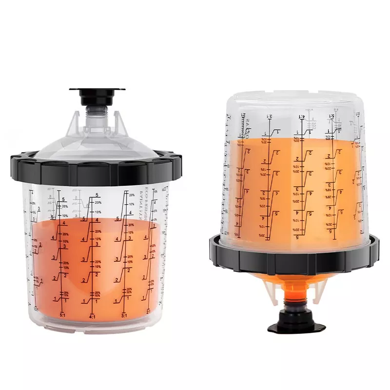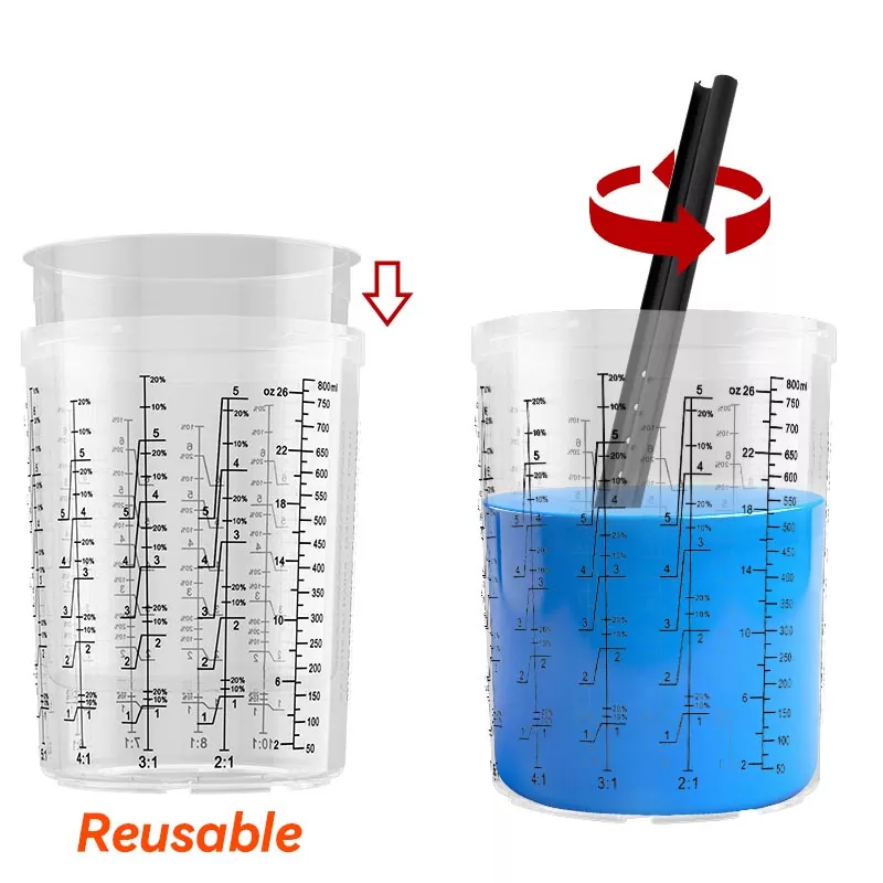 मिश्रण अनुपात स्केल संग पुन: प्रयोज्य बाहिरी कप। बाहिरी कपमा डिस्पोजेबल लाइनर घुसाउनुहोस् र लाइनरमा सीधै पेन्ट मिलाउनुहोस्। परम्परागत मिक्सिङ कप प्रयोग नगरी सामग्रीको लागत घटाउनुहोस्।